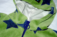 Svartvitrandig ekologisk tunn trikå inköpt på Tradera. Gulorangerandig velour från Jofotex.