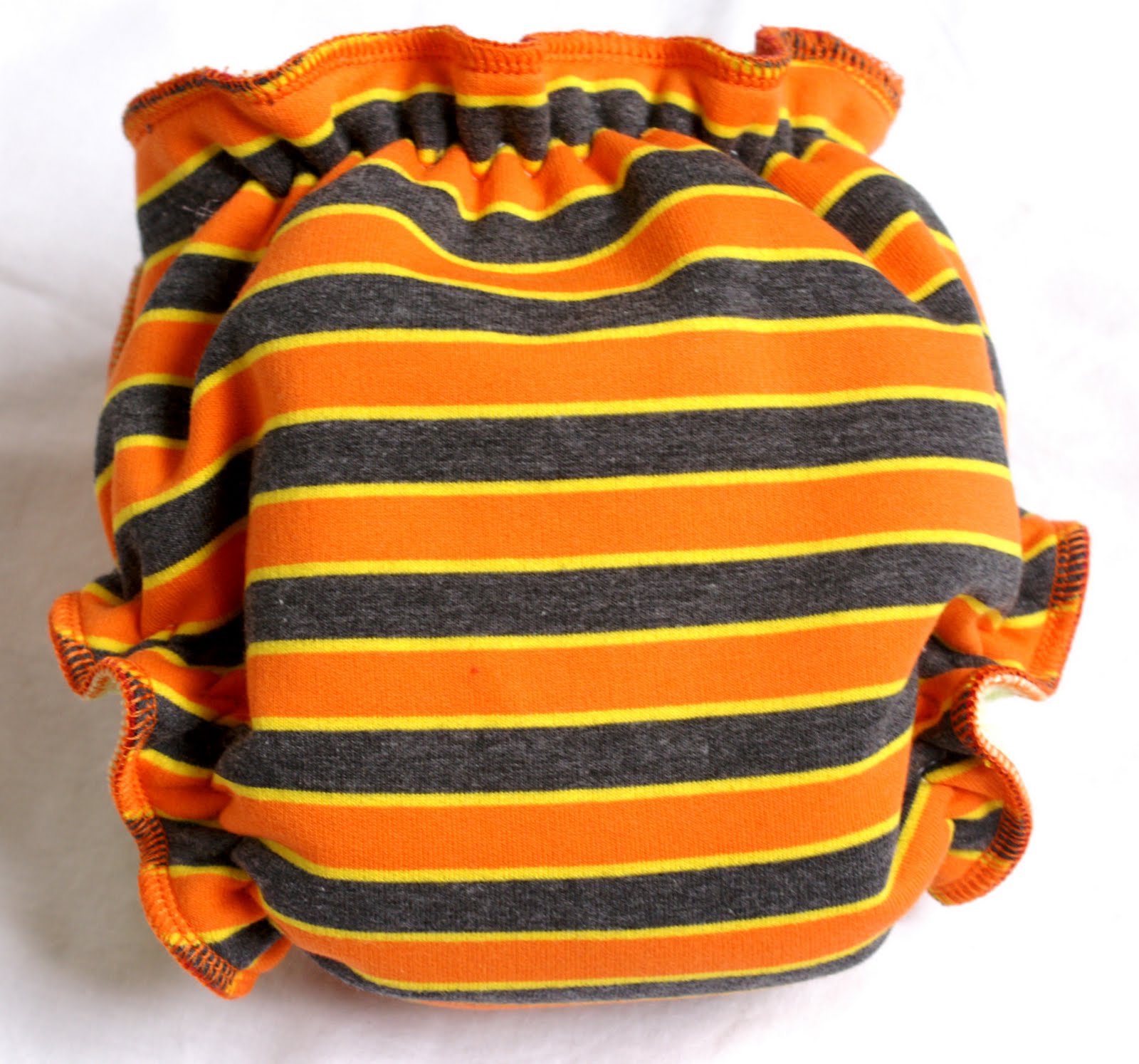 Tyget är det första tyg jag köpte i trikå när jag började sy för två år sedan. Nu har det förpassats ner till högen "fultyger" som ska användas till prototyper eller blöjor. Blöjan har även ett lager joggingtyg (som jag fått en hel hög med av svärmor) i mitten och innerst är det bambuvelour. Denna blöja är stoppad med en limpvikt rutvävd vikblöja. Det funkade toppen.