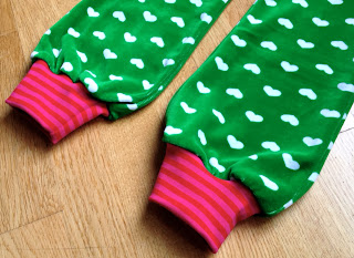 Först sydde jag ett par rakt efter mönstret Hugo från Ottobre nr 1/2013. De blev långa i benen och så tyckte jag att det såg lite tokigt ut med ett helt baksytcke. Visst, det var lättsytt men inte så snyggt. Tog lite stuvar jag hade hemma, Dots, från Tanyasum och som fortfarande finns i butiken. Sedan är det ett randigt tyg som är rester från en tröja jag sytt till mig själv.